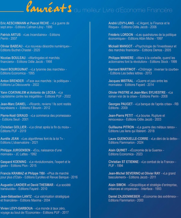 Les plus grands auteurs de l’économie financière ont été récompensés par ce prix : Christian SAINT-ETIENNE, Philippe JURGENSEN – André LEVY-LANG 20ème édition, Patrick ARTUS 21ème Olivier PASTRE et Jean-Marc SYLVESTRE 22ème, Georges PAUGET 23ème Augustin LANDIER David THESMAR 24 ème , Olivier RAY et Jean-Michel SEVERINO 25ème , Jean-Marc DANIEL 26ème Bertrand MARTINOT 27ème, Jacques MISTRAL 28ème, Gaspard KOENIG 29ème, Francis KRAMARZ et Philippe TIBI 30ème, Vivien LEVY-GARBOUA 31ème, Guillaume PITRON 32ème, Christian GOLLIER 33ème, Olivier BABEAU 34ème, Aurélie JEAN 35ème, Jean COATANLEM–Antonio de LECEA 36ème.